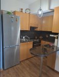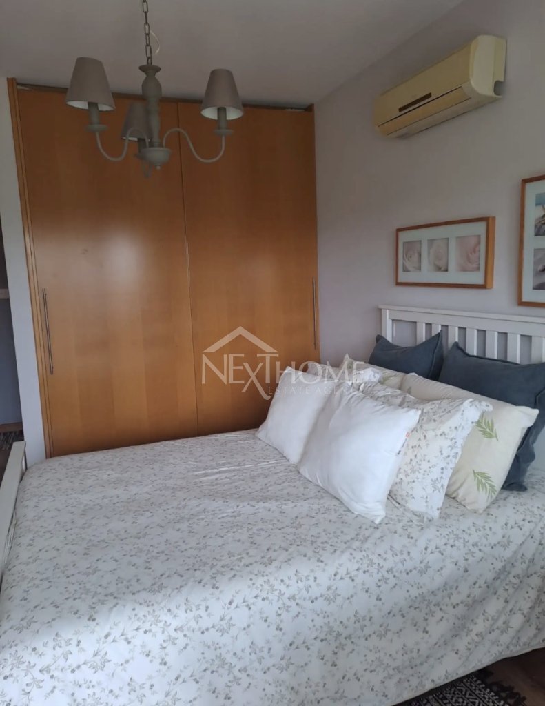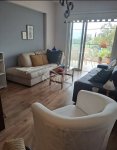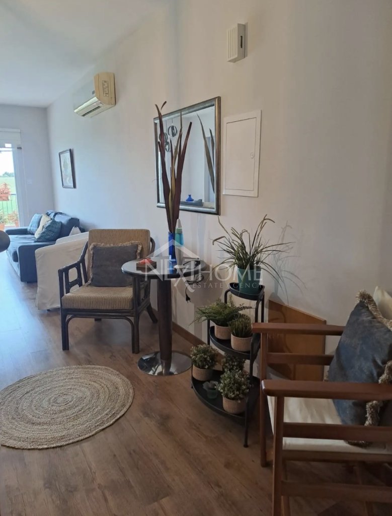 The property features a bright interior with a large balcony that allows plenty of natural light and offers pleasant views of the surrounding mountains and countryside. It includes air conditioning in both the living room and bedroom, fully equipped kitchen appliances, wooden flooring, a generous storage room, and private parking.