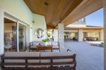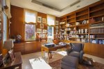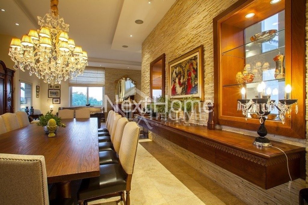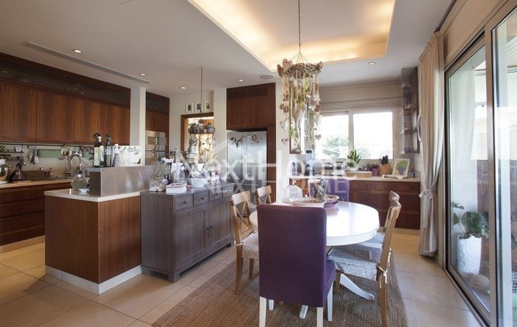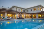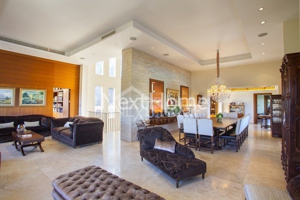 The children bedroom share a large bathroom with a double washbasin and two of the three children bedrooms have verandas and one of them has a private roof garden for exploring the night sky or enjoying the views of the area. At the ground floor there is a large double garage with electric remote controlled gate and next to it a very large storage room that can be used to add 2 bedrooms to service the house, elevator for 3 levels. Includes an open kids play ground,overflow swimming pool 12.5m X 5.5m with outside shower and w.c, fire system,inside fire alarm,security alarm with surveillance cameras. The iroko wood kitchen specially designed with a laundry room and with the brand Gaggenau for all electrical appliances needed for such villa. Next to the kitchen there is a sitting area with fireplace,the dining area seats for 16 people,two luxury living rooms,office covered with iroko wood with large library. The house has lots of valuable Cypriot antiquity saved in fixed iroko wood displays.